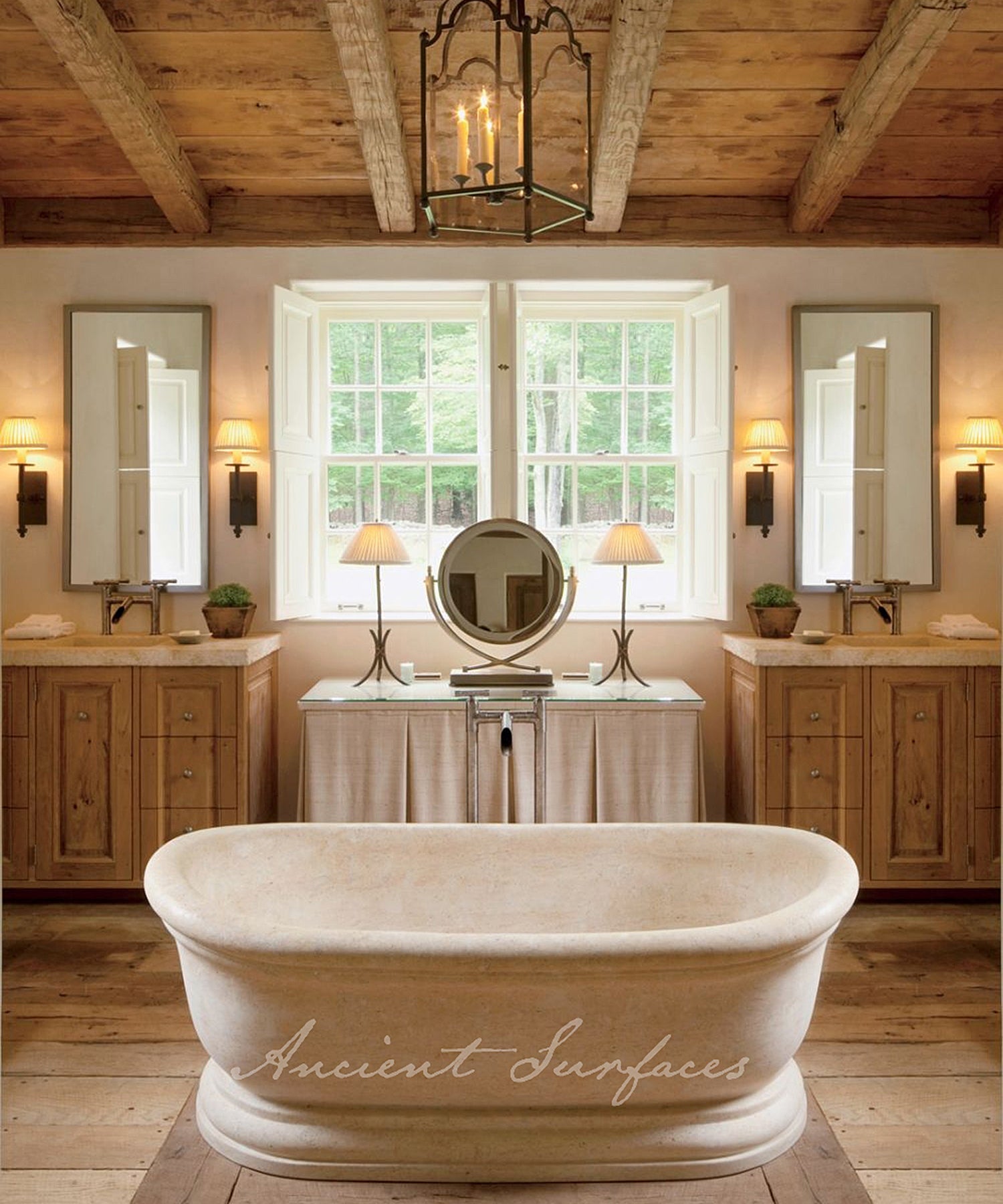 Each tub by Ancient Surfaces is sculpted from centuries old stone blocks, preserving natural veining, patina, and historic character.